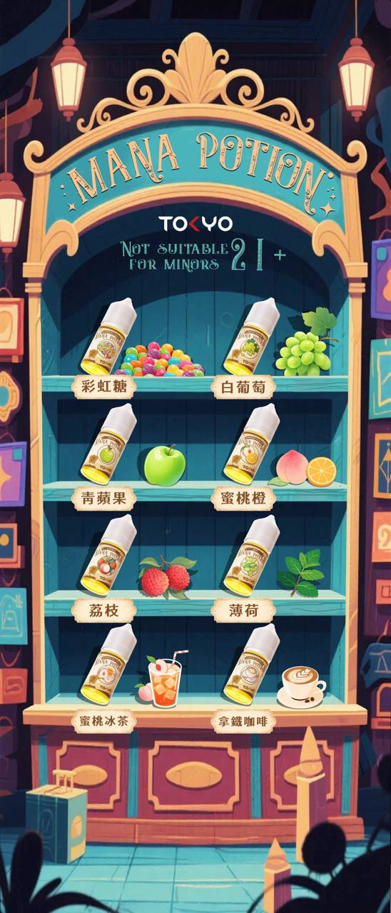荔枝 | 薄荷 | 彩虹糖 | 白葡萄 | 青蘋果 | 蜜桃橙 | 蜜桃冰茶 | 拿鐵咖啡