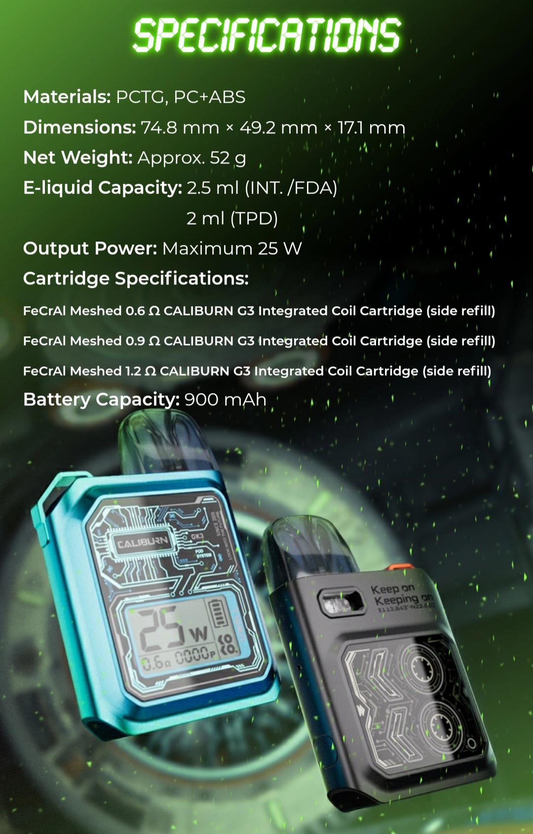 • 1x  0.9 歐姆 Caliburn G3 空煙彈