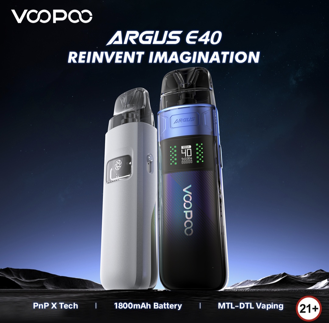 Argus E40 套件採用 1800mAh 電池設計,具備氣動式和按鍵擊發功能。該設備採用 PnP X霧化器技術,與 PnP X線圈相容,能提供更濃密的雲和更純淨的味道。